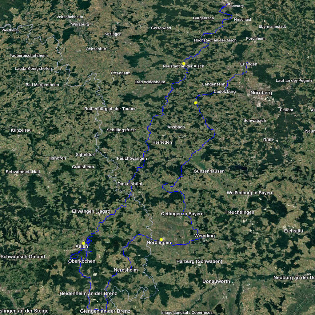 zeigen meine Übernachtungsorte an. Bei Aalen war ich zwei Nächte.